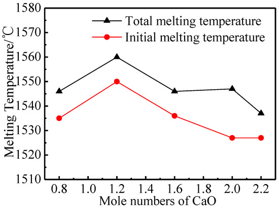 When the molar amount of CaO increased from 0.8 to 1.2, the initial melting and total melting temperature gradually increased [25], so that the 6BaO·1.2CaO·2Al2O3 could only be completely melted at 1560 °C. This was perhaps because the phase of aluminates was gradually transformed from the mixed phase of Ba3CaAl2O7 and Ba5CaAl4O12 to the single phase of Ba3CaAl2O7 as the molar amount of CaO increased. The mixed phase might be slightly eutectic, which led to lower initial melting and total melting temperatures, while the melting temperature of the single phase Ba3CaAl2O7 was higher. Then, the melting temperature decreased with the increase of the molar amount of CaO, which might be because the phase of aluminates was still dominated by the Ba3CaAl2O7 phase when the molar amount of CaO was greater than 1.2. There were more defects in the crystals and the grain size decreases, thus lowering the melting temperature.