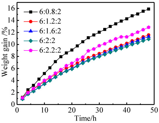 The aluminates exposed to air can react with CO2, water vapor, and so on, and the macroscopic evidence for this is the increase in mass. The degree of moisture absorption and CO2 absorption of aluminates can be judged from their weight gain rate [26]. Aluminates with low weight gain and high environmental stability will ensure the consistency and stability of the products in the cathode production process. Figure 4 shows the weight gain curves of aluminates with different molar amounts of CaO over 48 h. As illustrated in Figure 4, when the molar amount of CaO in aluminates was increased from 0.8 to 2.0, the weight gain rate of aluminates gradually decreased from 15.89% to 10.88% for 48 h, and the environmental stability gradually improved [5], which might be related to the perfection of crystal structure and the formation of single-phase Ba3CaAl2O7. When the molar amount of CaO was 2.2, the weight gain rate of aluminates increased, and the environmental stability became worse, which might be related to the Ca2+ entering into the interstitial position of Ba3CaAl2O7 and the structure becoming too loose. From another point of view, it could be deduced that the aluminates of single phase Ba3CaAl2O7 had high environmental stability. At the same time, the slope of the weight gain curve decreased gradually with the prolongation of storage time, which meant that the ability of the aluminates to absorb moisture and CO2 gradually became saturated. For 6BaO·xCaO·2Al2O3 aluminates, the proper amount of CaO could increase the stability of aluminates to a certain extent.