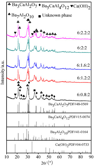 The XRD patterns of the aluminates that were exposed to air for 48 h are shown in Figure 5. When compared with Figure 1 and Figure 5, it could be seen that the diffraction peaks of aluminates appeared to broaden after moisture absorption and weight gain, and the reaction of aluminates with H2O and CO2 in air resulted in the gradual disappearance of Ba3CaAl2O7 phase structure and the formation of new phases, which included Ca(OH)2, Ba7Al2O10, and other unknown phases [26,27]. Three characteristic diffraction peaks of Ba3CaAl2O7 phase disappeared at 29~30° due to the serious hygroscopic absorption of aluminates with a molar ratio of 6:0.8:2.