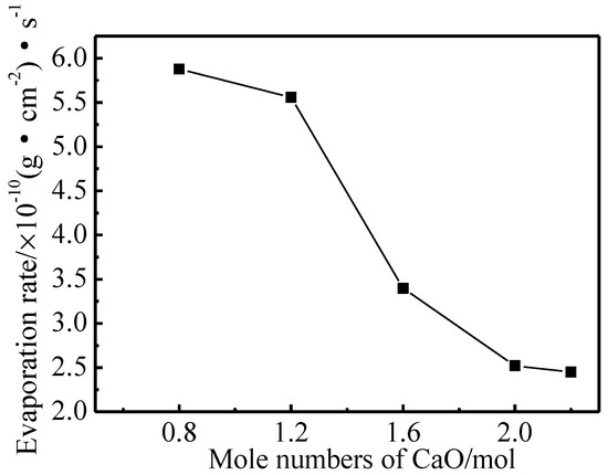 The evaporation rate curve of Ba-W cathodes that were prepared with five kinds of aluminates at 1050 °C are shown in Figure 7. It could be clearly seen that the average evaporation rate of impregnated aluminate-Ba-W cathodes decreased with the increase of the molar amount of CaO [25], which indicated that this increase could reduce the evaporation of electronically active substances and prolong the lifetime of the cathode at working temperatures. The evaporation rate of barium tungsten cathodes that were impregnated with 6BaO·2CaO·2Al2O3 aluminates in the porous tungsten matrix was only 2.52 × 10−10 g/(cm2·s). The mass ratio of Ba and BaO, as active vaporizers, determined the evaporation rate of the aluminates and usually PBa/PBaO > 1 [29,30], so the main evaporative specie of the Ba-W cathode was Ba. The molten phase of aluminates tended towards a single phase of Ba3CaAl2O7 with the increase of the molar amount of CaO, which indicated that the Ba3CaAl2O7 phase aluminates were likely to produce a BaO emitter with a lower evaporation rate when compared with the Ba5CaAl4O12 phase aluminates, while Ba5CaAl4O12 phase aluminates easily reacted with W to produce a high evaporation rate of Ba.