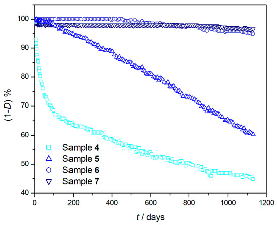 Samples were weighed at specific time intervals using a Mettler AE 240 electronic balance (±1 × 10−5 g). Samples 1–3 were weighed every 30–40 days; samples 4–7 were weighed once a day (first two weeks of measurements), and then three times a week (for 1 month), twice a week (for another month), and successively once a week; sample 8 was weighed once a day (first 2 months of measurements), then three times a week (for 3 months), and successively once a week; samples 9–10 were weighed once a day (first 2 months of measurements), then 3 times a week (for 3 months), successively once a week (for 3 months), and finally once a month. To this aim, crucibles were extracted from the oven, cooled in a desiccator for 1 h, weighed, and then immediately put in the oven again.