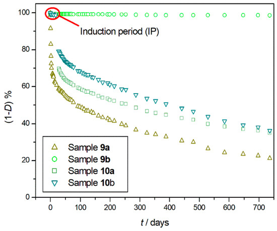 In order to quantify the uncertainty in the lifetime prediction of the studied polymers, a comparison among the measured trend of the real degradation and that extrapolated from the MacCallum equations has been performed, showing about twelve days of difference for sample 8a and about sixteen days for sample 8b [35]. It is worth to note that also in this case, where no IP was present, the real and the expected values were closer than the polymer for which an IP (although the slightest) is present.