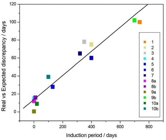 For sample 9b, which presented a very long IP at 150 °C, no matching was possible. Instead, for samples 10a and 10b, whose IPs were very short, a difference of the order of nine days was recorded in the comparison with real data, highlighting the hypothesis that the IP greatly influences the lifetime predictions achieved by extrapolating data obtained in the molten state.