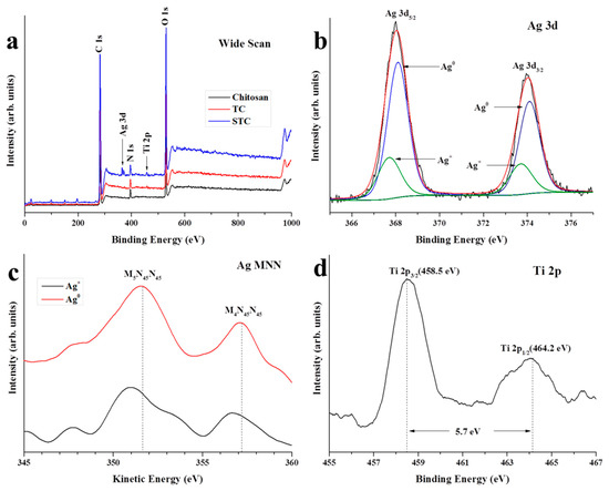X-ray photoelectron spectroscopy (XPS) of chitosan, TC, and STC. (a) Wide scan; (b) High resolution XPS Ag 3d spectra on the surface of STC; (c) Ag MNN Auger electron spectra of STC; and, (d) High resolution XPS Ti 2p spectra on the surface of STC.
