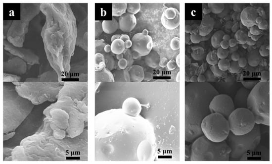 Figure 4 shows the microstructures of chitosan, TC, and STC composites. Chitosan presents an irregular sheet-like structure and dimensional inhomogeneity. After the reaction, similar morphologies were observed for the TC and STC composites. Both showed spherical micron particles, differing greatly from chitosan. It is probably because that with the addition of Span-80 surfactant during the preparation process, micelles were generated in paraffin, and then chitosan reacted with glutaraldehyde in the micelle structure, forming a spherical cross-linked product.