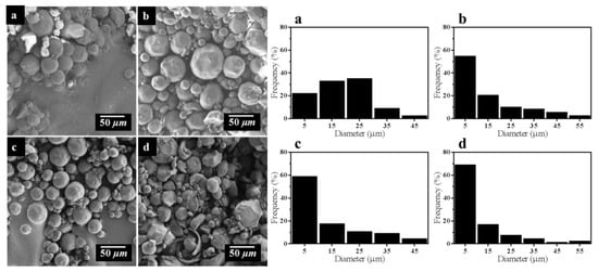 SEM images and particle size of STC composites with different cross-linking reaction time (a) 2 h, (b) 4 h, (c) 6 h, and (d) 8 h.