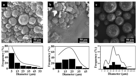 SEM images and particle size distribution of (a) STC-3, (b) STC-5, and (c) STC-8.