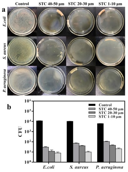Antibacterial activities of STC-3, STC-5, and STC-8 with typical particle size. (a) Flat colony counting method (Standard Norm ASTM E2180–07) for STC composites with typical particle size (1–10 μm, 20–30 μm and 40–50 μm), against E. coli (CGMCC 1.3373), S. aureus (CGMCC 1.2465) and P. aeruginosa (CGMCC 1.2620); and, (b) Antibacterial test quantitative evaluation results. The agar plates (bacterial concentration of 1 × 104 CFU/mL) without STC composites were treated as control group.