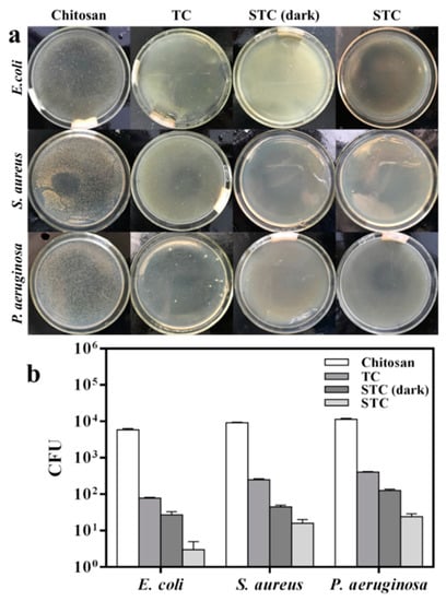 Effect of visible light photocatalysis on antibacterial activity. (a) Flat colony counting method (Standard Norm ASTM E2180–07) for chitosan, TC, STC-3 under visible-light conditions and STC-3 under dark conditions against E. coli (CGMCC 1.3373), S. aureus (CGMCC 1.2465), and P. aeruginosa (CGMCC 1.2620); and, (b) Antibacterial test quantitative evaluation results.