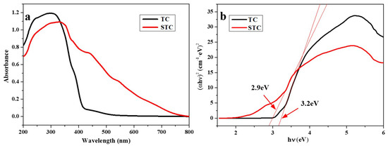 (a) Absorbance UV/vis spectra of TC and STC; and, (b) Determination of the band gap energy values for TC and STC.