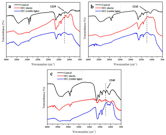 FTIR spectra of the (a) E. coli (CGMCC 1.3373), and (b) S. aureus (CGMCC 1.2465) and (c) P. aeruginosa (CGMCC 1.2620) before and after the treatment with STC under/without light exposure.