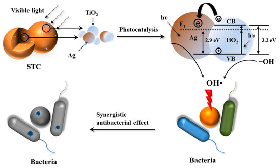 Based on the above results, the mechanism of photocatalytic activity of STC is proposed. Figure 12 shows the schematic diagram of antibacterial mechanism. Especially, under visible-light conditions, the surface plasmon resonance of Ag NPs on TiO2 is excited by visible-light irradiation [48]. Moreover, the recombination of the electron-hole pairs at the surface of TiO2 is inhibited by the silver ions acting as the electron traps, which are released from the Ag NPs doped in TiO2 in the aqueous solutions under aerobic conditions [40]. Then, silver ions were reduced to silver [49,50,51]. Thus, the surface electron excitation and electron-hole separation of TiO2 are enhanced [52]. Next, the photo induced holes oxidize the surface hydroxyl groups of TiO2. It leads to the release of hydroxyl radicals with strong oxidizing and antibacterial properties [23,24,49,52]. In addition, when the STC-3 is in the aqueous solution, the silver and TiO2 NPs that are incorporated in the cross-linked chitosan microspheres can be released slowly due to the swelling effects of cross-linked chitosan matrix, and the bactericidal performance can be sustained [53]. When compared to the traditional water disinfection technology (chlorine, ozone, and ultraviolet irradiation), STC is a better antibacterial agent [54].