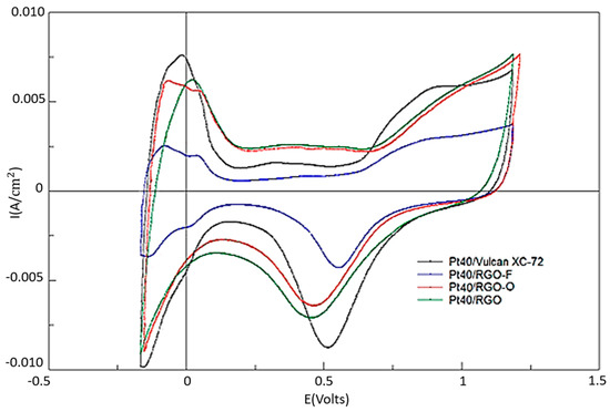 Figure 4 presents the results of cyclic voltammetry studies of the Pt40/Vulcan XC-72, Pt40/RGO, Pt40/RGO-O, and Pt40/RGO-F catalysts. The calculated values of the electrochemically active surface area (EASA) of the synthesized electrocatalysts were 57, 48, 51, and 20 m2/g Pt, respectively. These EASA values are a bit smaller than expected, taking into account the Pt particles’ size. This could be attributed to a poor utilization of the catalyst surface. When graphene-like materials are used as catalyst supports, the method of catalyst synthesis and the type of graphene precursor significantly influences the EASA of the resulted catalysts [32,33,34,35]. For instance, the catalyst utilization can change from 28% to 93% depending on the synthesis procedure for graphene-supported catalysts [32].