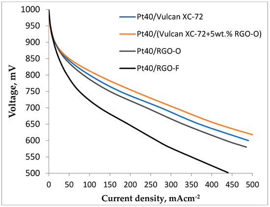 The study of the above-described electrocatalysts as a cathode material in proton exchange membrane fuel cells (PEMFC) demonstrated that the activity of RGO and RGO-O-based electrocatalysts is quite close to that of Vulcan XC-72-based ones (Figure 5). RGO and RGO-O-based catalysts have almost the same activity in the oxygen reduction reaction (ORR) in PEMFC. The current density in the case of RGO-O was only 1–2% higher than in the case of RGO. The activity of the RGO-F-supported catalyst is much lower due to the low EASA.