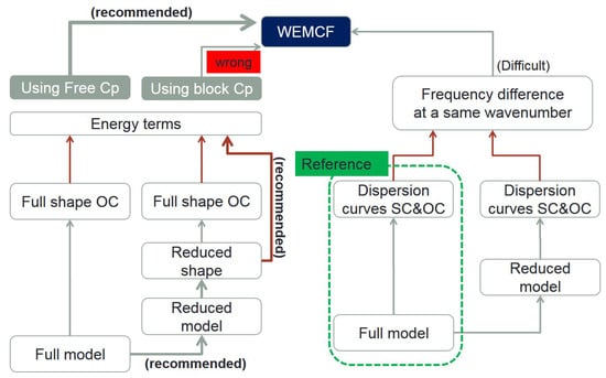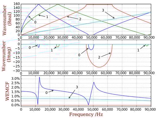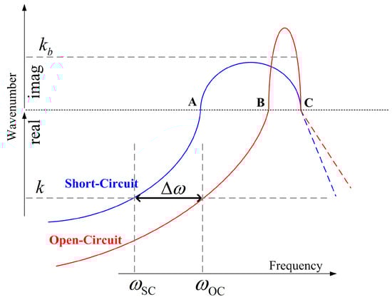 Definition of WEMCF by Equation (2) may be reasonable and intuitive. However, there are two main challenges. The first one is that Equation (2) works only for propagating waves, because band gaps may have different depth in OC and SC statuses, shown in Figure 1. Consequently it is difficult to link the evanescent waves between OC and SC, for example in Figure 1 the wave with wavenumber does not have its corresponding wave in the SC case. The second challenge is related to computational issues. For complex waveguide whose dispersion relations has veering and intersection (examples can be found in reference [30,31]), it will be difficult to correlate same type of propagating waves from the dispersion relations at OC and SC statues.