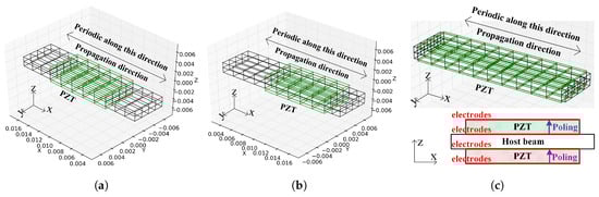 Unit cells of the piezoelectric waveguides: (a) unit cell A; (b) unit cell B which is a non-symmetric way of choosing the unit cell for the infinite periodic structure with unit cell A; (c) unit cell C which has longer PZT patches. The Piezoelectric materials are polarized along the z axis, and the electrodes fully cover the surfaces parallel to the x-y plane (orthogonal to the polarized direction). The program code used to generate the Finite Element models in ANSYS can be found in the Supplementary Files.