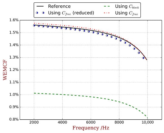 Comparison of WEMCF calculated by using: full WFEM with (labelled by ‘Reference’), full WFEM with (labelled by ‘using ’), full WFEM with (labelled by ‘using ’) and reduced waveshape with (labelled by ‘using (reduced)’).