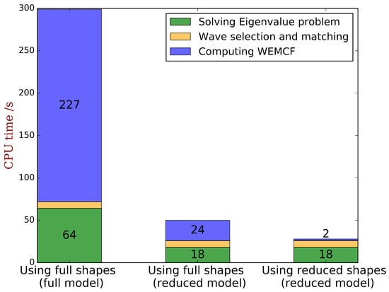 CPU time for the full dispersion characteristics with WFEM of unit cell A by the energy formula where the energies are calculated by: (1) using full shapes obtained from full WFEM; (2) using full shapes obtained from reduced WFEM; (3) using reduced shapes. The label ’Wave selection and matching’ refers to the standard post-processing of the WFEM results in order to identify the same type of wave among different frequencies [36], not the matching between the results between the OC and SC status as required for computing the frequency formula of WEMCF.
