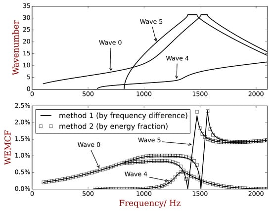 The comparison of WEMCF calculated by the frequency formula and the energy formula . Waves 0, 4 and 5 are selected from the full dispersion curves in Figure 11b. The is calculated by the reduced wave shapes as recommended in the last section.