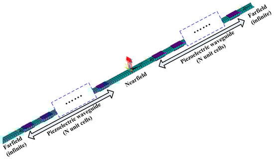 To illustrate the usage of the WEMCF, let us consider a built-up structure constructed by bonding groups of co-located piezoelectric patches onto a uniform host structure. N groups of piezoelectric patches are periodically distributed at the right side of the excitation while N other groups are located on the other side. The structure is infinite both to the left and right side. The FEM/WFEM hybrid method [31] can be used to analyse the energy flow and forced response. To do that, this structure is divided into five parts: one nearfield part, two piezoelectric waveguides and two uniform far-field waveguides, as shown in Figure 14.