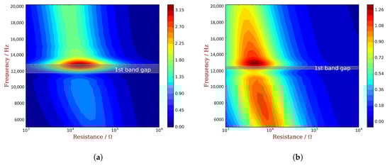 Parametric study of power transmission loss with respect to frequency and resistance, when the piezoelectric waveguides use: (a) unit cell A; (b) unit cell C.