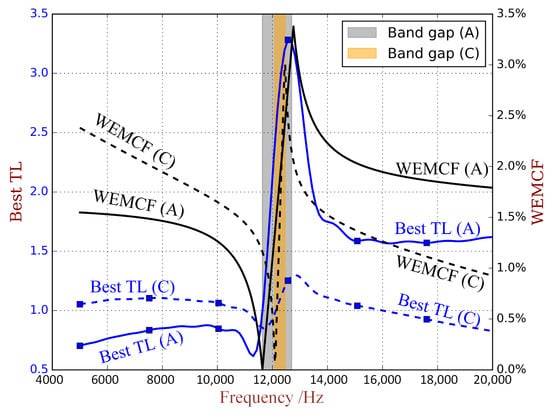 To illustrate this correlation more clearly, we plot the best TL with respect to the frequency when using unit cells A and C in Figure 16, in association with the WEMCF of wave 0 of unit cell A and C. In the first propagating zone, we can see that unit cell A has stronger WEMCF than C, and the best TL when using A is better than C. In the second propagating zone, we can see that unit cell A has weaker WEMCF than C, and the best TL when using A is weaker than C.