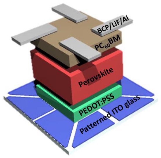 Schematic of inverted planar perovskite solar cells (PSC) device. The PSC is composed of ITO/PEDOT:PSS/CH3NH3PbI3-xClx/PC60BM/BCP/LiF/Al. The single ITO substrate comprised four pixels and the illuminated areas of each pixel were 0.04 cm2.