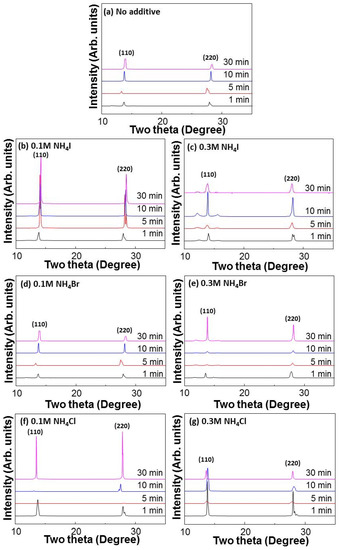 XRD spectra of CH3NH3PbI3-xClx layers spin-coated on PEDOT:PSS layers. The CH3NH3PbI3-xClx solutions used for spin-coating contained (a) no additive, (b) 0.1 M NH4I, (c) 0.3 M NH4I, (d) 0.1 M NH4Br (e) 0.3 M NH4Br (f) 0.1 M NH4Cl, and (g) 0.3 M NH4Cl respectively. The samples were annealed at 100 °C for different times (1, 5, 10, 30 min).
