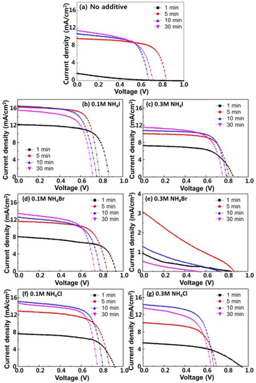 Figure 5 shows the current density-voltage (J-V) curves of the CH3NH3PbI3-xClx PSCs with NH4I, NH4Br, and NH4Cl as additives. As a reference, a CH3NH3PbI3-xClx PSC without any additive was also fabricated, as shown in Figure 5a. The open-circuit voltage (VOC), short-circuit current (JSC), fill factor (FF), and power conversion efficiency (PCE) of the PSCs employing the films with additives, are summarized in Table 1. The perovskite layers were annealed at 100 °C for different times. The annealing times were 1, 5, 10, and 30 min. For the reference CH3NH3PbI3-xClx PSCs, the highest PCE of 5.40%, was achieved with the film annealed for 5 min. The corresponding JSC, VOC, and FF were 0.84, 9.45, and 0.68, respectively. The same PCE (4.64%) was achieved with annealing times of 10 min and 30 min. On the other hand, when the CH3NH3PbI3-xClx layer was annealed for 1 min, the JSC, VOC, FF, and PCE values declined significantly to 1.64 mA cm−2, 0.81 V, 0.15, and 0.20%, respectively. Thus, it could be deduced that the cubic perovskite was not formed when the perovskite layer was annealed for 1 min. However, the PCE of the CH3NH3PbI3-xClx PSCs employing the films with additives was higher than that of the PSCs employing the films without additives annealed for 1 min. The VOC, JSC, FF, and PCE of 0.86 V, 12.2 mA cm−2, 0.67, and 7.31%, respectively achieved using 0.1 M NH4I were significantly higher values. When 0.1 M NH4I was used as the additive and the perovskite layer was annealed for 5 min, the highest efficiency was obtained. The corresponding VOC, JSC, FF, and PCE values were 0.78 V, 16.3 mA cm−2, 0.72, and 9.13%, respectively. The PCE was 69% higher than that of the PSCs employing the perovskites without additives, under the same conditions. It was confirmed that the PCE decreased with longer heat treatment. When the concentration of NH4I was increased to 0.3 M, the PSC performance declined. Unlike the case with 0.1 M NH4I, where the highest PCE was achieved with the film annealed for 5 min, the highest PCE attained with 0.3 M NH4I was achieved with annealing for 10 min. The corresponding VOC, JSC, FF, and PCE were 0.79 V, 10.8 mA cm−2, 6.70, and 6.06%, respectively. Thus, it was confirmed that the higher the concentration of NH4I as the additive, the longer the required annealing time. The CH3NH3PbI3-xClx PSCs with the NH4Br-treated film showed remarkably low performance when 0.3 M NH4Br was added, compared to 0.1 M NH4Br. The VOC, JSC, FF, and PCE values of the PSCs employing the 0.1 M NH4Br-treated film were 0.85 V, 11.7 mA cm−2, 0.66, and 6.57%, respectively, whereas that of the PSCs with the 0.3 M NH4Br-treated films were 0.87 V, 3.09 mA cm−2, 0.23, and 0.61%, respectively, when annealing was performed for 5 min. When 0.1 M NH4Br was used as the additive, the Br− in NH4Br did not affect the CH3NH3PbI3-xClx structure significantly. However, when 0.3 M NH4Br was added, it is considered that Br− bonded with CH3NH3PbI3-xClx and disrupted the cubic structure. On the other hand, the performance parameters of the PSCs were higher when NH4I and NH4Cl were used as additives. It is considered that I− and Cl− helped to maintain the cubic structure of the perovskite. The VOC, JSC, and FF were 0.80 V, 15.1 mA cm−2, and 0.67, respectively, for the highest PCE of 8.13%, achieved with 0.1 M NH4Cl. With the use of 0.3 M NH4Cl, the VOC, JSC, FF, and PCE values were 0.67 V, 14.4 mA cm−2, 0.63, and 6.13%, respectively. The performance of the CH3NH3PbI3-xClx PSCs employing the films treated with NH4I, NH4Br, and NH4Cl as additives was investigated. The additive is related to the grain size of perovskite. As a result, the diffusion length of the active layer became longer as the grain size increased, confirming that JSC and PCE were increased. It can also be seen that a small amount of additive was more effective than a large amount. In addition, it was confirmed that the annealing time affected the characteristics of the perovskite solar cells due to the decrease in efficiency, as the annealing time became longer.