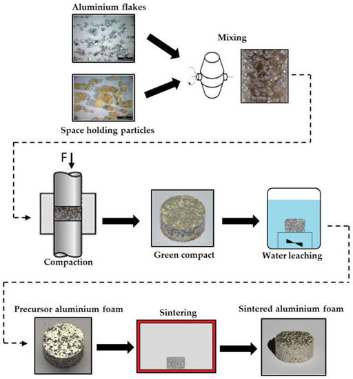 For fabrication of open-cell topology metal foams, the main manufacturing processes are: Vapor phase deposition or electro-deposition of metal into a polymer foam precursor, infiltration of a preform, use of molten metal on a replaceable precursor, and powder processing with space holder particles. During powder processing with space holder particles, porosity can be introduced by adding an additional phase (space holder particles) to the metal powder to retain spaces in the material, which can be removed afterwards by chemical or thermal (during sintering) means [17,18,19,20,21]. The shape of the space holder particles controls the pore morphology of the pore structure. Common choices for space holder particles are carbonate particles, carbamide particles, NaCl particles, expanded polystyrene granules, magnesium particles, polystyrene spheres, and, more recently, the saccharose crystals [22,23,24,25]. During the space holding method, the space-holder particles are mixed with metallic materials in powder form. Typically, the metal particles are smaller than the space-holder particles, and a small amount of an additional agent is usually needed to achieve a better mixture and binding of powders [26,27,28,29].