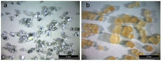 Materials used in the manufacturing process of the open-cell aluminum foam: (a) Aluminum flakes, (b) saccharose particles.