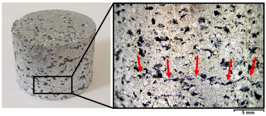 The aluminum flakes and the space holding particles were mixed with a combined volume fraction of 60% and 40%, respectively. For mixing the particles, a laboratory powder mixer was used for 2 min at low speed, in order to retain the morphology of the aluminum flakes as much as possible. The mixed materials were put into a cylindrical stainless steel die, followed by a cold compaction of the mixture with the use of a mechanical press. The final green compact sample had a cylindrical geometry with a diameter of 25 mm and a height of 15 mm. After the uniaxial pressing, the compacts were placed into distilled water for the removal of the crystalline saccharose particles. At the next stage of the manufacturing procedure, the sintering process took place with the aid of an electric inductive oven, in order to strengthen the Al-matrix network of the green precursor foam, see Figure 1.