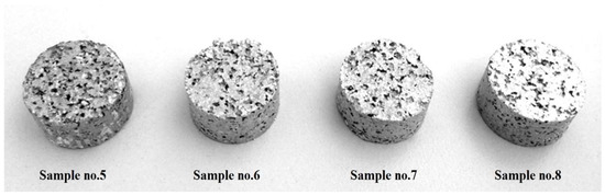 A series of compaction experiments were carried out by varying the pressure from 100 to 250 MPa, namely 100, 150, 200, and 250 MPa, in order to find the optimum compaction pressure, see Table 1. Sample sets 1 and 2 with compaction pressures 100 and 150 MPa respectively, presented unstable bonding of the flakes which led to surface wall delamination during the dissolution stage. Sample set 4, with a compaction pressure of 250 MPa, presented no wall delamination. However, during the extraction from the die, the cylindrical samples presented cracks at mid-height, perpendicular to the pressing direction, resulting in unsteadiness of the precursor foam structures, as shown in Figure 3. The optimum green compact was produced at relatively low compaction pressures (200 MPa), and the excellent mixture of materials was easily achieved with no additional binder to assist the mixing. The applied mixing procedure at the optimum compaction pressure (Sample sets 3, 5, 6, 7, 8 and 9) produced a uniform space-holder-particle distribution, without any deterioration.
