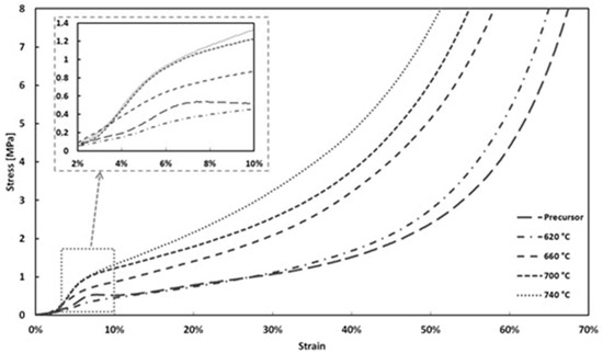 Figure 7 depicts the compressive stress-strain response of the Al-foam precursor and for Al-foams after the sintering process at temperatures of 620 °C, 660 °C, 700 °C, and 740 °C. The curves are characterized by the typical initial elastic response, followed by a deformation plateau with a positive slope and finally a transition to densification. Also, in the plateau region of stress-strain curves, the absence of any stress oscillations is to be noted. The non-fluctuated stress-strain curves imply a ductile deformation in the plastic region. Due to the morphology of the flakes, only a minor material separation was observed, due to a non-uniform deformation of the structure. The stress at the macroscopic yield point and the subsequent plateau stress at a certain strain, increase with increasing sintering temperature of the foam. Furthermore, one of the characteristics of the compressive stress-strain curves is a very smooth plateau region, as a result of the homogeneously distributed pores and their narrow size range. The foam with no sintering process also has a significant high plateau stress, something that was expected due to the angular morphology of the flakes and the propagation of an entanglement process between them during pressing. In order to investigate the elastic region more precisely, the elastic region was magnified from the stress-strain curves. Stress variations in the elastic region were found to be nonlinear, which can be explained by the imperfections and defects during the compaction procedure.