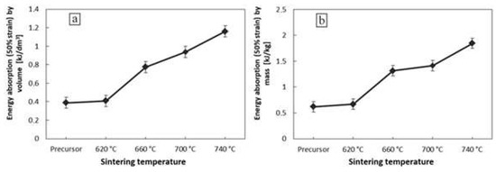 The variation of energy absorption by volume and mass for 50% strain in aluminum foams with various sintering temperatures is presented in Figure 8. The energy absorption is an important parameter affecting the utility of the material as an energy absorbing capacitor. The sintering temperature affects the magnitude of the compressive plateau stress. Thus, the foams sintered at higher temperatures exhibit a greater energy absorption capacity due to a higher compressive strength. Moreover, the aluminum foam introduces strong mechanical properties due to the morphology of the flakes even without the effect of the sintering process.