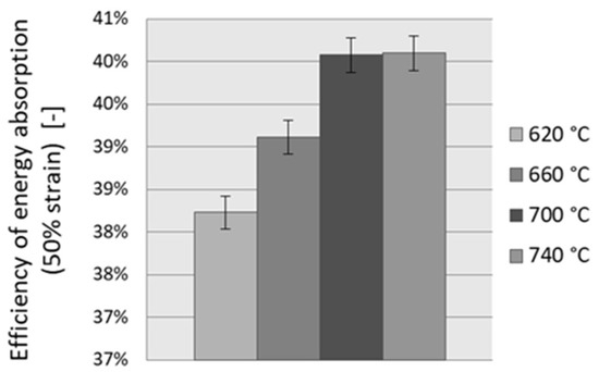 Efficiency of energy absorption for 50% strain for Al-foams with various sintering temperatures.