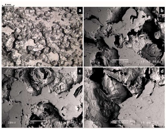 The microstructure of metallic foam after sintering plays an important role in the characteristics of the final foam. The cell shape, cell size, and cell type are among the most important features that should be considered more carefully. In this paper, scanning electron microscopy was used to observe the pore morphology (irregular and angular), pore size, and pore shape due to its high-quality imaging. The microstructural characterization was performed for specimens sintered at 740 °C due to the improved mechanical properties obtained from the conducted compressive experiments. Specimens for microstructural evaluation were cut from sintered samples through Electro Discharge Machining, which was carried out parallel to the pressing direction. Subsequently, specimens were cold mounted in a high viscosity resin and subjected to a metallographic preparation, including mechanical grinding followed by polishing with diamond suspensions. The high viscosity resin was chosen in order to keep the interior pores free from resin, for better microstructural observations. For the scanning electron microscopy (SEM) examination, a Philips XL30 device at 20 kV was used; all samples were subjected to standardized metallographic mounting and polishing techniques. Figure 10a–d illustrates the typical microstructure of the cell wall of the aluminum foam samples sintered at 740 °C. The porous structure, due to the addition of space-holders, is open and interconnected. The windows are derived from the dissolution process of saccharose particles. The cell walls are not fully dense but contain some interstices that probably originated from the compaction stage and are retained after sintering (microporosity). Moreover, this process contributed to a non-uniform orientation and distribution of the pores. However, during sintering, some shrinkage occurs, which modifies the expected pore size. It is assumed that shrinkage occurs homogeneously.