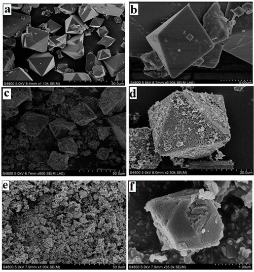 Scanning electron microscope (SEM) images of the surface of (a,b) pristine Cu-BTC, (c,d) NH2-Cu-BTC and (e,f) sub-NH2-Cu-BTC. Note BTC = 1,3,5-benzenetricarboxylic acid.