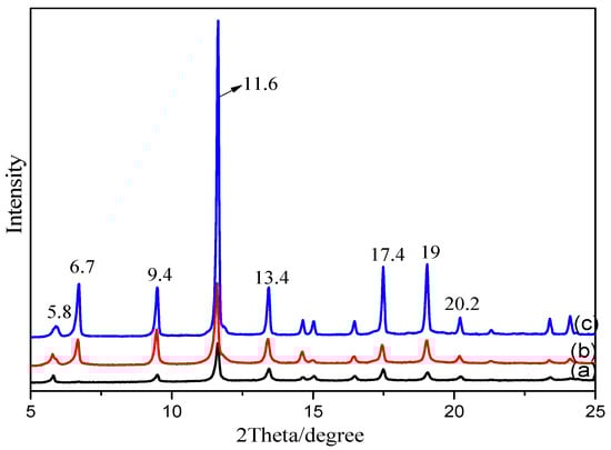 The X-ray diffraction (XRD) patterns of (a) Cu-BTC, (b) NH2-Cu-BTC and (c) sub-NH2-Cu-BTC.