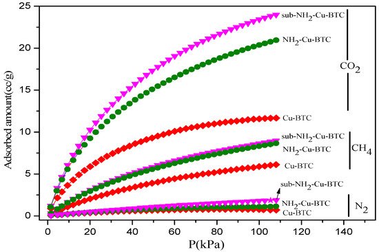 CO2, N2, and CH4 adsorption isotherms of Cu-BTC at 308 K.