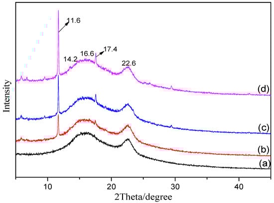 The XRD patterns of (a) pure Pebax membrane, (b) Pebax/Cu-BTC MMMs, (c) Pebax/NH2-Cu-BTC MMMs and (d) Pebax/sub-NH2-Cu-BTC MMMs (3 wt.% MOFs content in the MMMs).