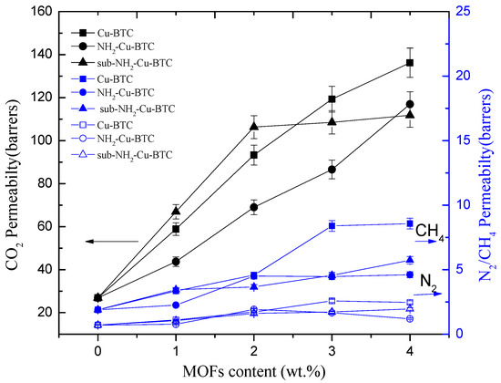 The gas permeation properties of MMMs are mainly affected by the interface morphology of the continuous and dispersed phases. To investigate the effect of different types of MOFs and filler loadings on the membrane separation properties, Pebax/MOFs MMMs with different loadings of Cu-BTC, NH2-Cu-BTC, or sub-NH2-Cu-BTC were fabricated. The gas permeability and selectivity of CO2/N2 and CO2/CH4 at 25 °C and 0.1 MPa of the feed pressure are shown in Figure 8 and Figure 9, respectively. All experiments were performed at least three times, and the average results are reported. A comparable increase in the CO2 permeability of MMMs fabricated with different types of MOFs with the Pebax membrane results in an increase in the selectivity of CO2/N2 and CO2/CH4 than that of the pristine Pebax membrane. The CO2 permeability of MMMs increased with the increase of Cu-BTC loading, and the improved permeability can be mainly attributed to the defects at the inorganic–polymer interface. Moreover, the strong quadrupole moment of CO2 has a higher affinity with unsaturated Cu sites than N2 and CH4, but the increase in the N2 and CH4 permeability is not clear. The results are consistent with the results of N2, CO2, and CH4 adsorption measurements. Furthermore, the CH4 permeability is slightly higher than that of N2. This is probably because the critical temperature of gases decreases in the following order: CO2 (304.2 K) > CH4 (190.7 K) > N2 (126.1 K). A higher condensability shows a higher solubility of the gas in the polymer matrix [32], which results in a higher permeability. Therefore, the selectivity of CO2/N2 is higher than that of CO2/CH4. The selectivity of CO2/N2 and CO2/CH4 also increased with the increase in Cu-BTC loading. However, above the Cu-BTC loading of 4 wt.%, both the selectivity of CO2/N2 and CO2/CH4 of MMMs decreased due to poor compatibility and presence of nonselective voids at the inorganic-polymer interface.