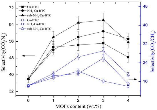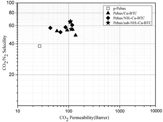 Furthermore, Figure 8 and Table 2 show that the CO2 permeability of MMMs incorporated with sub-NH2-Cu-BTC is higher than that of MMMs doped with NH2-Cu-BTC, but worse than that of pristine Cu-BTC. The presence of nanoparticles in the polymer matrix disrupts the chain packing and changes the structural regularity of the polymer–nanoparticle interface. Void spaces are formed due to weak compatibility at the interface of the polymer and nanoparticle phases that serve as channels to transport gas molecules more effectively. As shown in Figure 6, the MMMs incorporated with pristine Cu-BTC had worse compatibilities with the polymer matrix, which exhibited a higher CO2 permeability compared to the functionalized Cu-BTC. The permeability of MMMs doped with sub-NH2-Cu-BTC can be attributed to the smaller size of fillers after the submicrometer treatment and the presence of more amino and carboxyl groups on the crystal surface at the same loadings. Correspondingly, the MMMs incorporated with sub-NH2-Cu-BTC show a better selectivity of CO2/N2 and CO2/CH4. However, at a higher MOFs loading ratio, such as the loading above 4 wt.%, the increase in the rate of CH4 and N2 permeability is higher than that of the CO2 permeability based on the void spaces between the polymer matrix and nanoparticles, which leads to the deterioration of the gas separation selectivity. Compared with results reported in other literature, which directly incorporated pristine MOFs or amine functionalized MOFs [19,42], we found that the dispersion of functionalized MOFs became better in the Pebax matrix if the crystal size was effectively regulated. The CO2 permeability in the Pebax/sub-NH2-Cu-BTC was 303% higher than neat Pebax due to the fine dispersion and the presence of groups with a superior CO2-philicity in the framework. The ideal selectivity of CO2/N2 and CO2/CH4 was equally higher than that of the neat matrix.