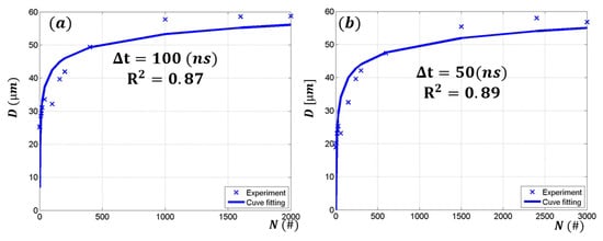 From Equation (6), and can be obtained by linear interpolation and substitution. The single-shot ablation threshold fluence and incubation coefficient are tabulated in Table 2. Figure 5 shows the crater diameters versus the number of laser pulses applied to the same spot at a constant fluence. The solid line shows a curve fitting according to Equation (8). The single-shot ablation threshold fluences are 40.9 , 36.3 , 14.8 , and 9.79 for the 100 , 50 , 20 , and 8 pulse duration, respectively. The incubation coefficients were 0.75, 0.74, 0.84, and 0.82 for the 100 , 50 , 20 , and 8 pulse duration, respectively. Attained ablation threshold for the 8 pulse duration is very similar to the literature, where the ablation threshold is observed in the range of 5.1 and 11 [38,44,45]. However, ablation thresholds for the other pulse durations are hardly found from the literature. The coefficient of determination () is shown for each pulse duration in Figure 5. The short pulse duration (8 and 20 ) resulted in a relatively good fitting and high values. However, the long pulse duration (50 and 100 ) showed low values. Furthermore, value decreased as the pulse duration increased. This may have been due to heat accumulation effect. Since longer pulse duration leads to deeper thermal depth and longer exposure time to laser energy, heat accumulation may have been more pronounced. Thus, wider and deeper melting-zone formation may result in the deviation.