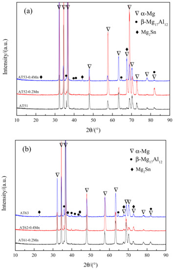 When the content of Sn is constant, with the increase of Al, the β-Mg17Al12 diffraction peak becomes increasingly obvious, and the Mg2Sn diffraction peak becomes more obvious, too. As Al content increases, the solid solubility of Sn in Mg decreases, thus producing Mg2Sn phase.