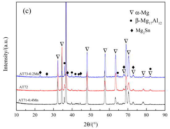 The XRD pattern with the same content of Al in Figure 1 shows that the β-Mg17Al12 diffraction peak is more obvious with the increase of the content of Sn. When the content of Sn is 3 wt.%, the Mg2Sn diffraction peaks appear in AT53-0.4Mn, AT63, and AT73-0.2Mn alloys. This indicates that with the increase of Sn, the content of β-Mg17Al12 and Mg2Sn phase in the cast alloy increases.