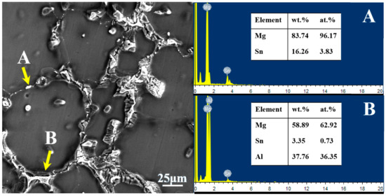 The Energy dispersive spectrometry (EDS) results of the main phase in the as-cast AT63 alloy. (A) Mg2Sn; (B) Mg17Al12.
