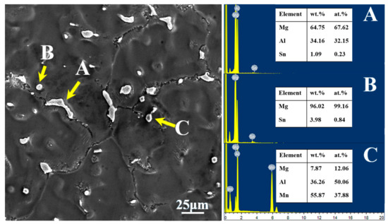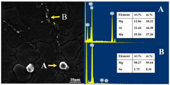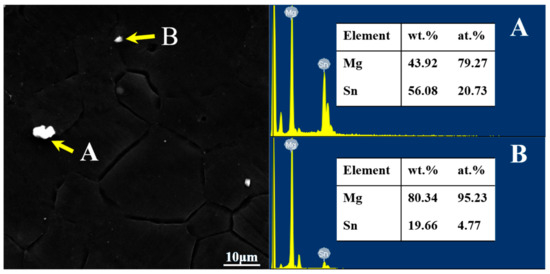 As can be seen from Figure 6, there are bright white particles in the extruded AT63 alloy with different sizes (as shown in A and B). The EDS analysis shows that the bright white particles are the Mg2Sn phase. The β-Mg17Al12 phase in the cast alloy was completely dissolved into the magnesium matrix during the homogenization process, and it was not precipitated during the extrusion process.