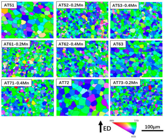 Figure 4 presents EBSD inverse-pole figure (IPF) maps of the extruded Mg-Al-Sn-Mn magnesium alloys. IPF maps of nine kinds of extruded alloys are arranged in the order of orthogonal experimental design, too.