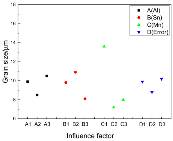 In order to understand the influence of Al, Sn, and Mn content on the grain size for the extruded Mg-Al-Sn-Mn magnesium alloys, the diagram of the relationship between factors and indicators (grain size) is shown in Figure 5. As shown in Figure 5, Mn is the main factor affecting grain size. With the content of Mn from 0 wt.% to 0.2 wt.%, the grain diameter decreases rapidly. However, when the content of Mn is increased to 0.4 wt.%, there is a rising trend. Therefore, the optimum Mn element content is 0.2 wt.%. Similarly, the best choice of Al and Sn are 6 wt.% and 3 wt.%, respectively. So, the AT63-0.2Mn alloy has the minimum grain size, in theory. It is not included in the designed nine kinds of alloys, yet. The AT61-0.2Mn and AT73-0.2Mn alloys have the smallest grain size in all alloys, reaching 6.8 μm.